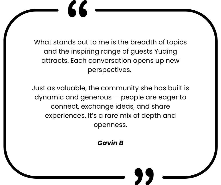 Hello, I'm Yuqing (Quin) Wang, Founder & CEOMy background spans science and technology — through two PhD research projects in nanomaterials and work as an IT consultant—as well as pedagogy, yoga, and leadership coaching.I built this circle because I don’t enjoy superficial networking, small talk, or noisy group chats that go nowhere. I value depth, effectiveness, and real connection.When I can’t find the kind of space I am looking for, I build one — for myself and others who feel the same.