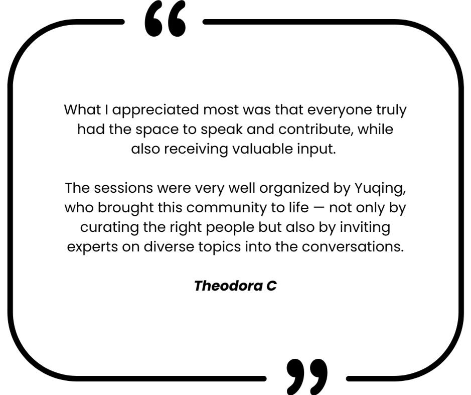 We’re building a thoughtful, inspiring circle. If this sparks your curiosity, we’d love to meet you and explore whether it feels like the right fit.Curious and motivated individuals can currently join up to two Peer Circle sessions for free — a special opportunity before our membership fee is introduced.